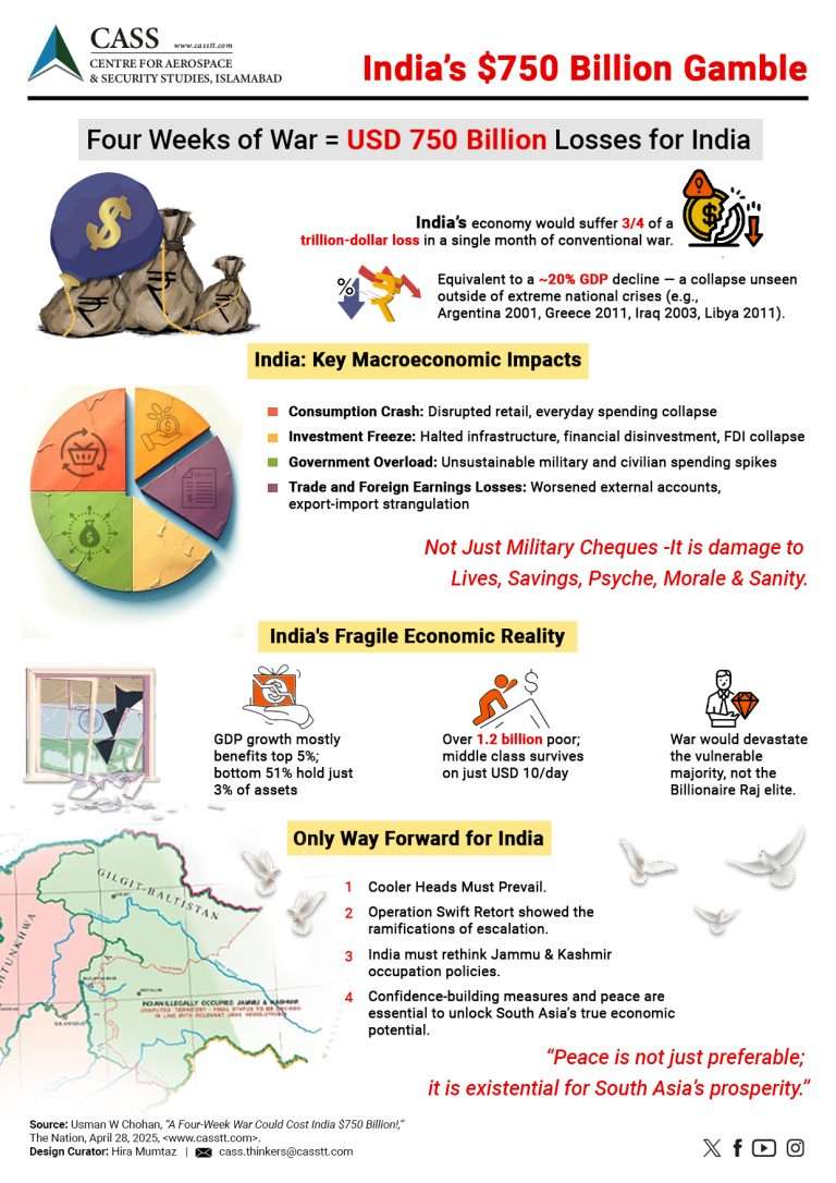 Download PDF Keywords: IIOJK, Pakistan, India, BJP, Economy, War, Pahalgam Source: Usman W Chohan, “A Four-Week War Could Cost India $750 Billion!,” The Nation, April 28, 2025